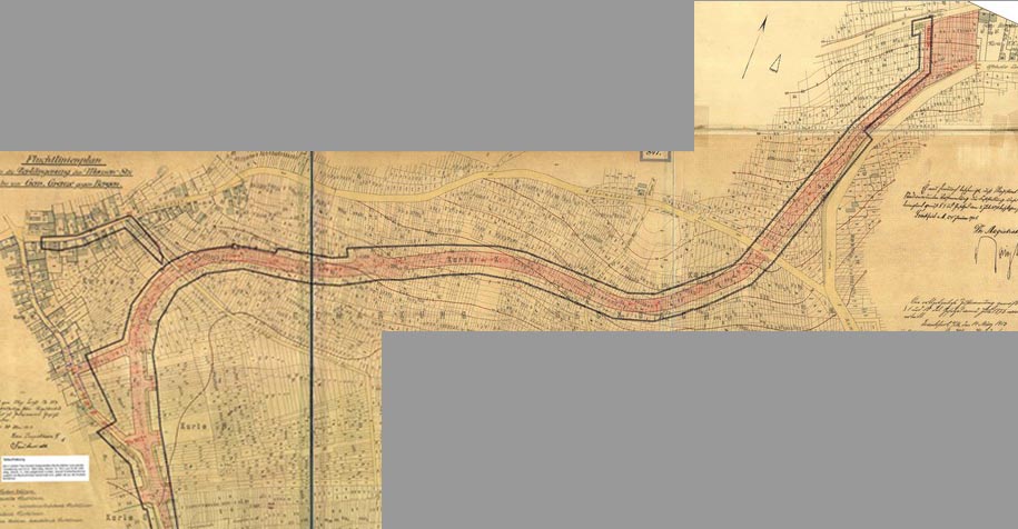 Auf dem nachstehenden Ausschnitt aus dem Fluchtlinienplan F-847 vom 9.5.1913 sind die extrem zersplitterten Grundstückverhältnisse gut zu erkennen.