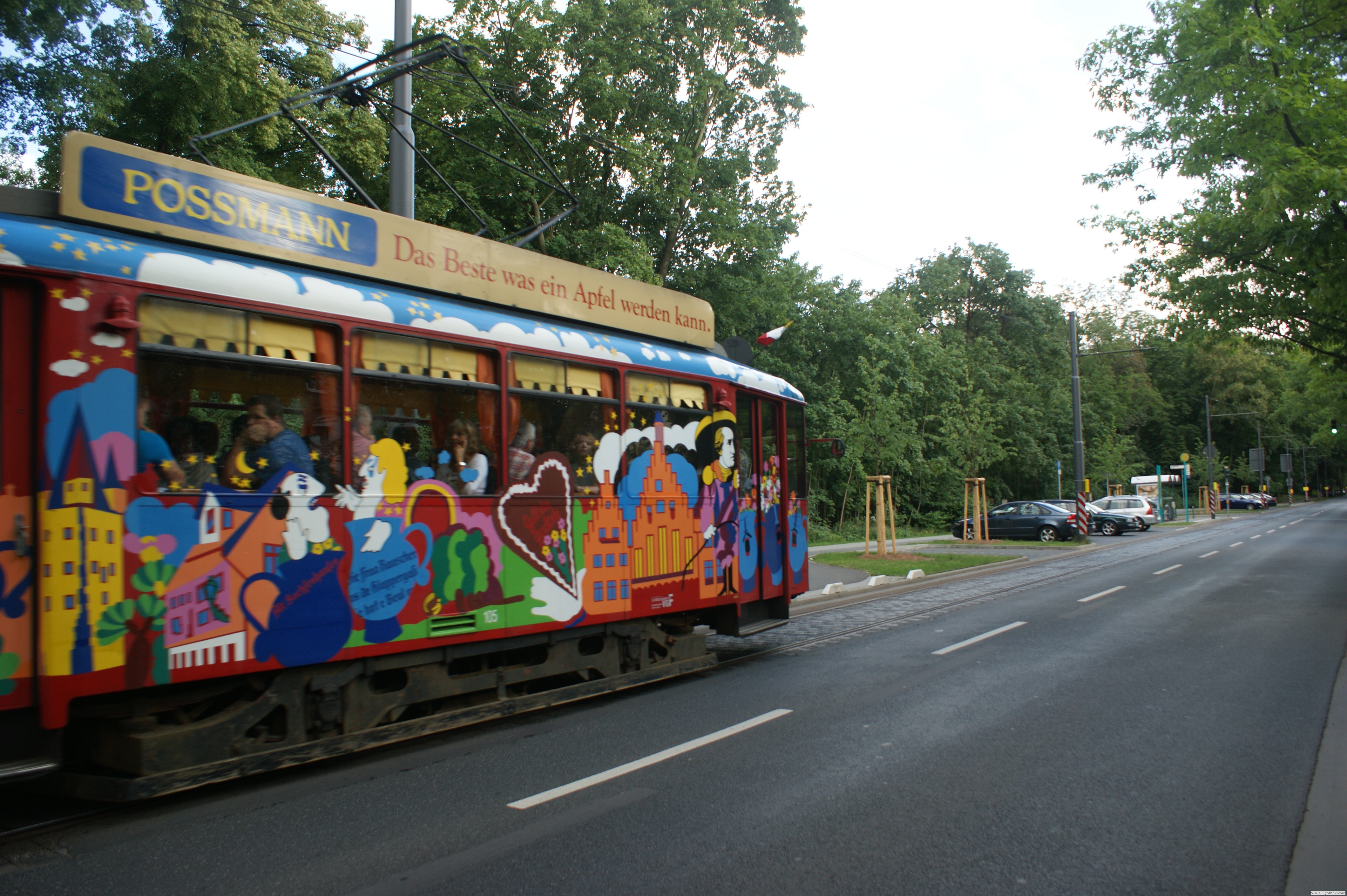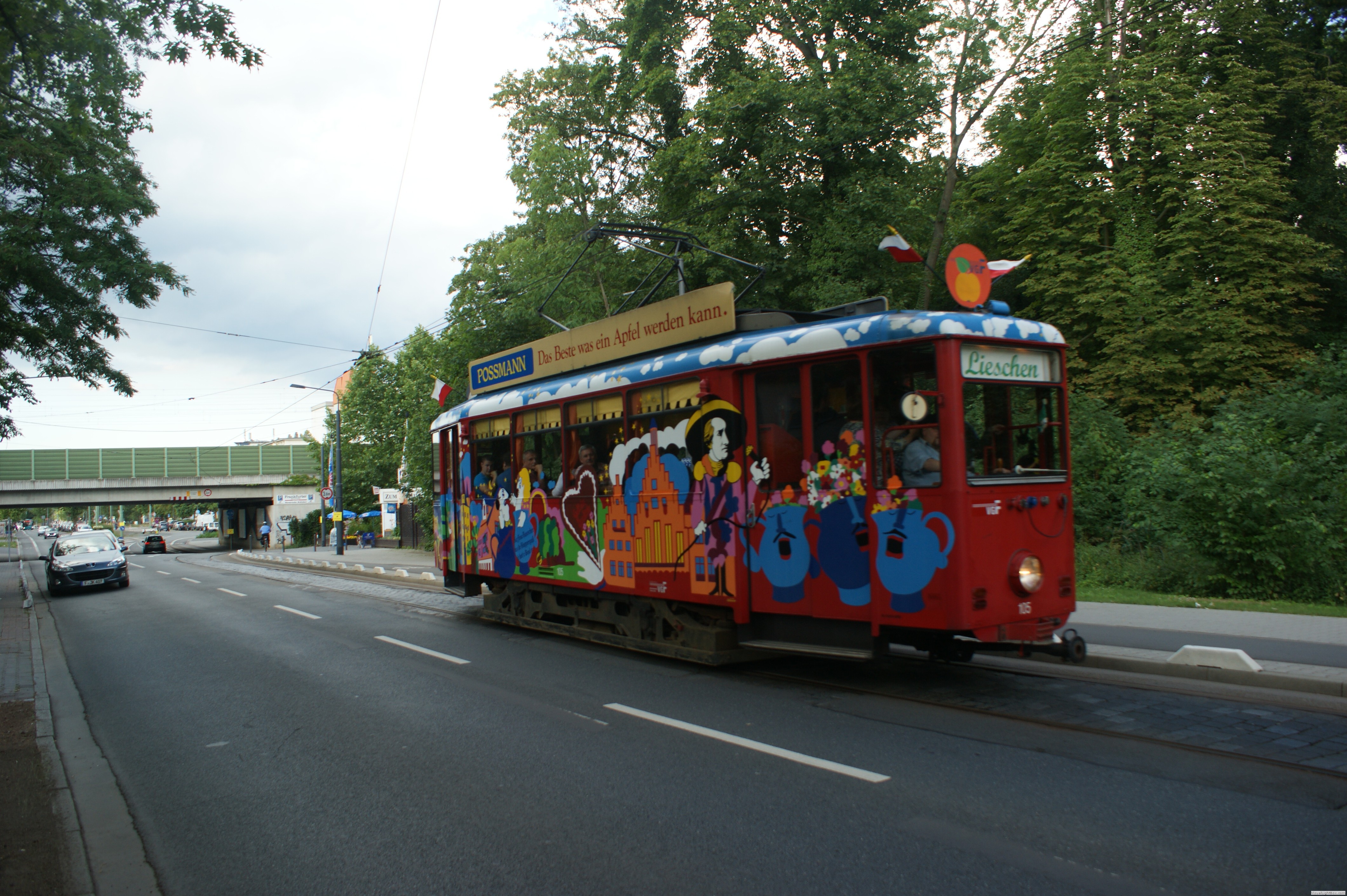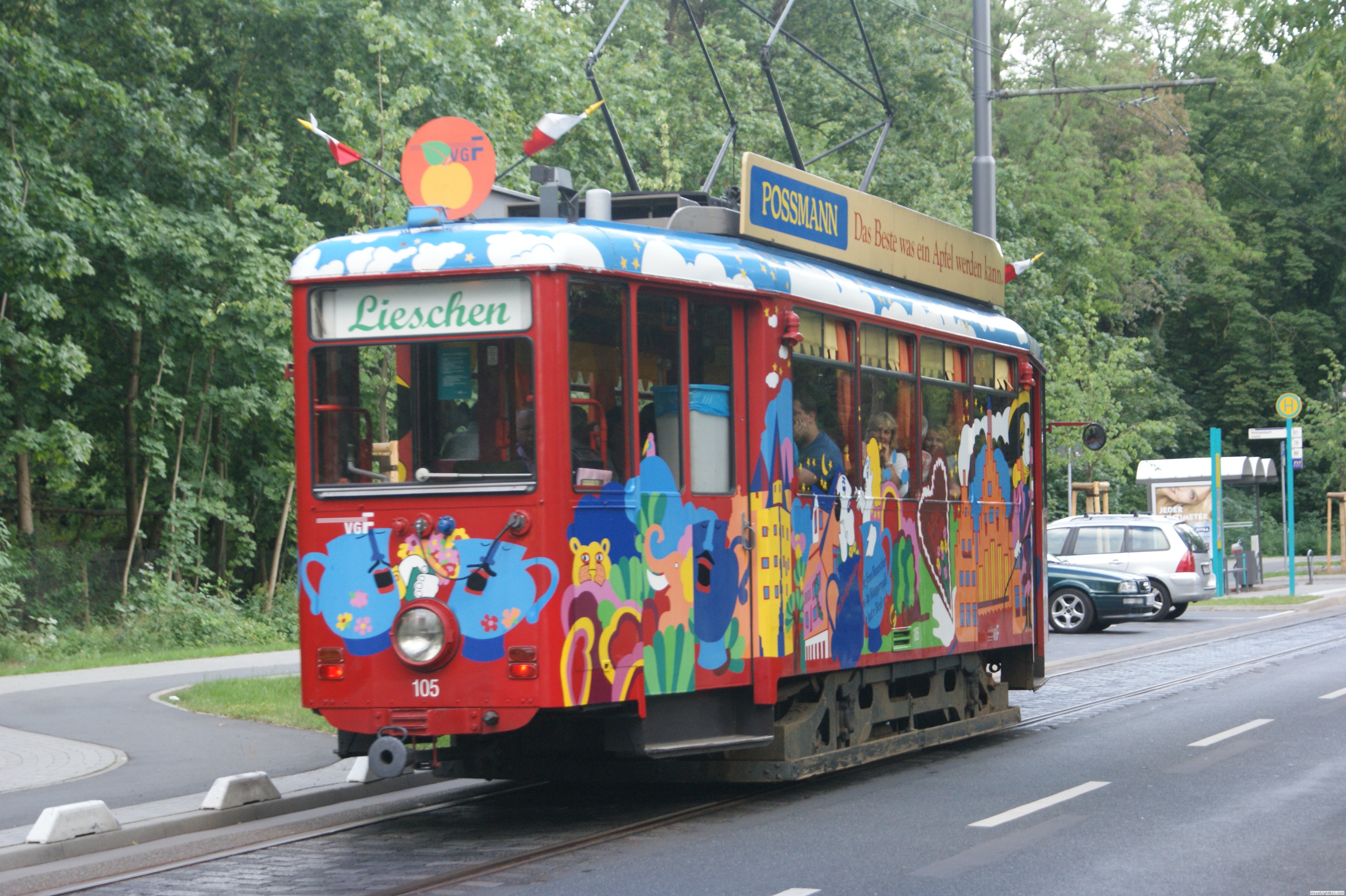 Die Lackierung hat er einer Orchideen Ausstellung die 1975 im Plamengarten stattfand zu verdanken. Er fristete dann sein Leben als Kaffee im Hof eines Hotels in Oberaula. Die vermutlich letzten Fotos dieses Wagens hat mir Andreas Höfler zur Verfügung gestellt. Die Aufnahmen stammen aus dem Jahr 1988. Das Lieschen dürfte auch die letzte Linie sein, die zu Festtagen mit Wimpeln neben dem Linienschild geschmückt war. Diese Tradition war einst Standard,- insbesondere wenn Messen in Frankfurt am Main stattfanden waren die Linien die zum Messgelände fuhren mit Wimpeln geschmückt.